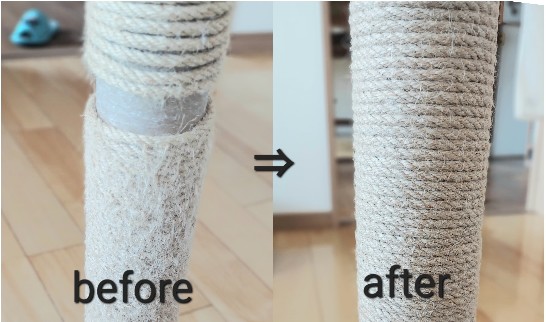 巻き替えたあと、さっそくうにとてんがチェックしに来てくれました。 新しい麻の感触が気に入ったのか、以前よりも勢いよくバリバリしてくれています。
